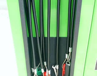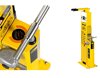 Der er et større antal værkøjer at vælge imellem, men som standard er sættet ret komplet (billede). Værktøjerne er ophængt i coatede stålwires med rustfri svirvel, så værktøjerne er nemme at håndtere og wirerne ikke filtres. Pumpen har manometer og rustfrit stempel, der klarer dæktryk helt op til 10 bar. Ventilhovedet i letmetal er naturligvis til alle de gængse ventiltyper. Til stationen kan også leveres en hjulholder.